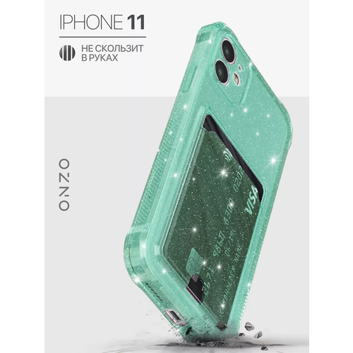 Противоударный чехол на iPhone 11 / Айфон 11 с карманом для карт, прозрачный зеленый с блестками