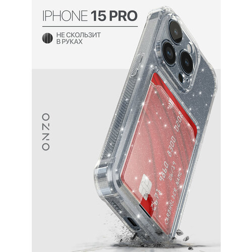 Прозрачный чехол на iPhone 15 Pro с карманом для карт / Бампер на Айфон 15 Про с усиленными углами, с блестками