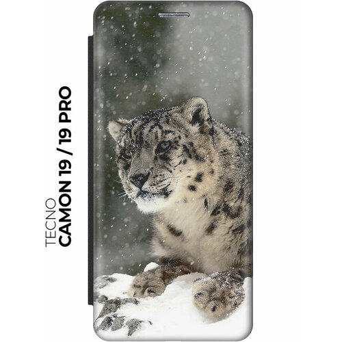 Чехол-книжка на Tecno Camon 19 / 19 Pro / Техно Камон 19 / 19 Про с рисунком "Барс и падающий снег" черный