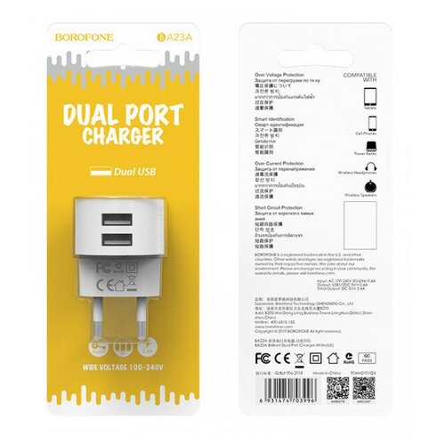Сетевое зарядное устройство Borofone BA23A, 2xUSB, 2.4 А, белое