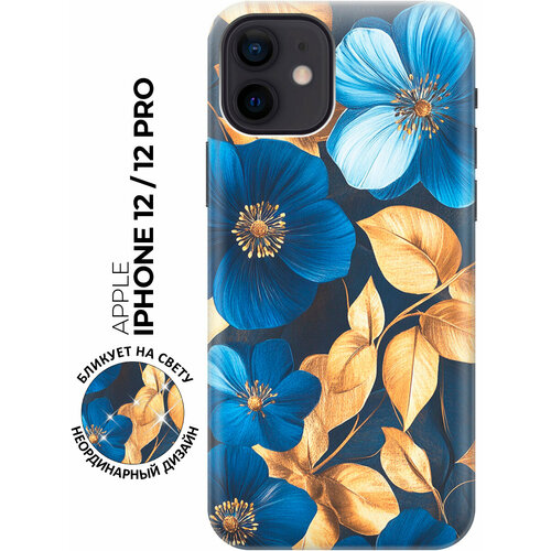Силиконовый чехол на Apple iPhone 12 / 12 Pro с принтом "Синие цветы, золотые листья"