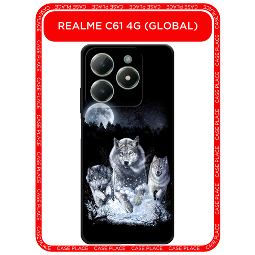 Черный матовый чехол на Realme C61 4G (Global) / Реалми C61 4G с принтом Стая волков под луной