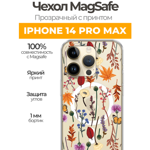 Чехол на Айфон 14 Про Макс (Apple iPhone 14 Pro Max) MagSafe с магнитом и принтом "Orange Purple flowers"