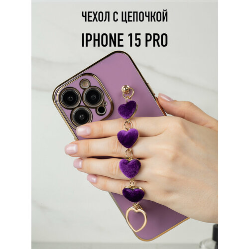 Глянцевый силиконовый чехол на iPhone 15 Pro с цепочкой из сердечек