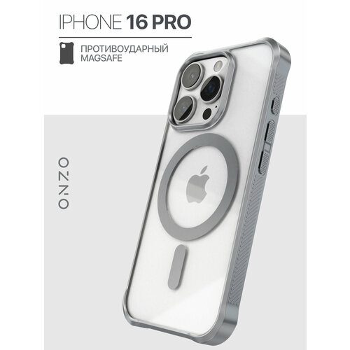Противоударный чехол на iPhone 16 Pro с мэгсэйф / Бампер на Айфон 16 Про прозрачный с серебристыми рамками
