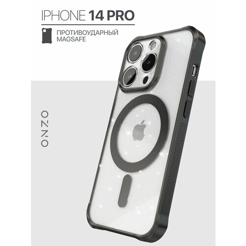 Противоударный чехол мэгсэйф для iPhone 14 Pro / Айфон 14 Про с рельефными черными гранями, прозрачный с блестками