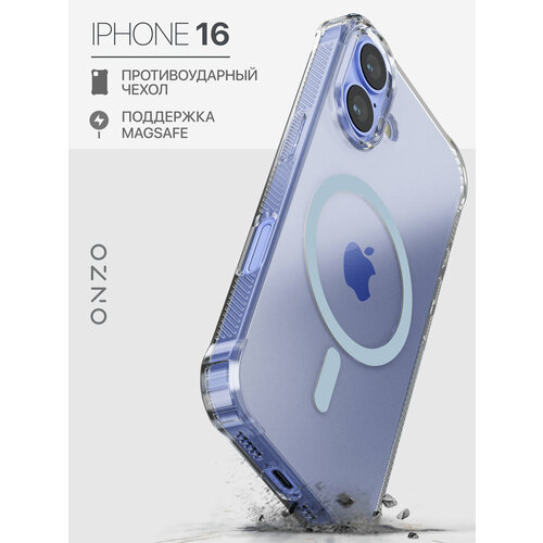Чехол Magsafe голубой на iPhone 16 прозрачный / Накладка на Айфон 16 с усиленными углами
