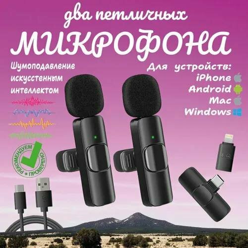 Беспроводной петличный микрофон с шумоподавлением K3 Android - Type С iPhone iPad - Lightning две петлички на прищепке