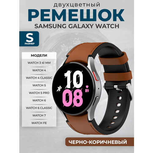 Двухцветный кожаный ремешок для Samsung Galaxy Watch 3/4/5/6/7/FE, размер S, черно-коричневый, серебристая пряжка