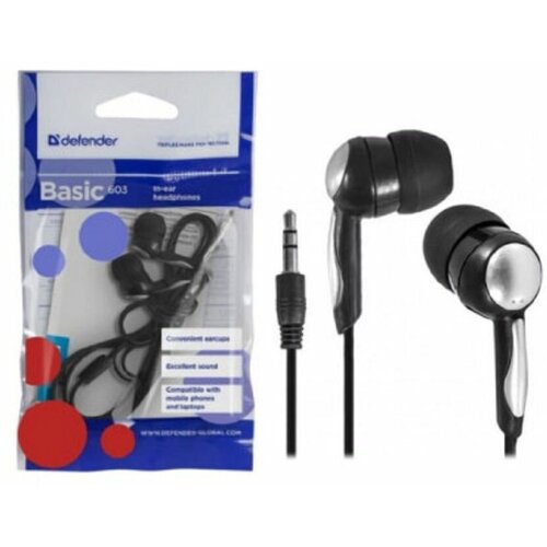 Наушники Defender Basic 633, вкладыши, черные(В наборе1шт.) черный