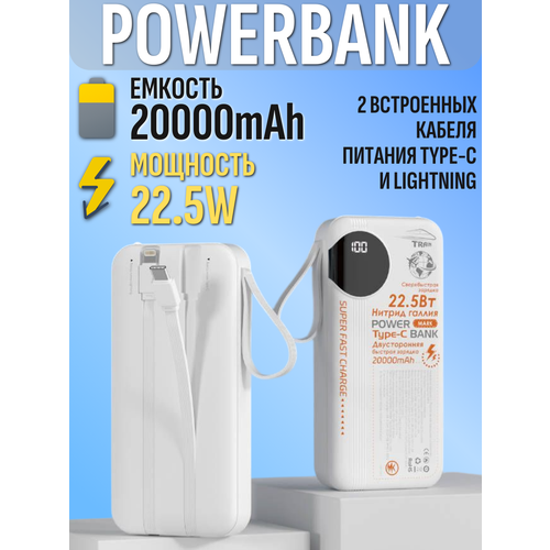 Внешний Аккумулятор Powerbank 20000 mAh , Мощность 22.5w со встроенными кабелями