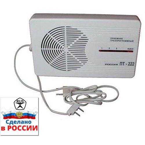 белыйПеред покупкой убедитесь В наличии И В исправности точки проводного вещания! Вилка радио С плоскими штырьками!данный товар НЕ предназначен для людей С ограниченными возможностями!данный товар НЕ предназначен для людей С ограниченными умственными И психическими отклонениями !данный товар требует умственных навыков И аккуратного И точного использования согласно инструкци! НЕ предназначен для людей С инвалидностью И старше 65 ЛЕТ!Приемник трехпрограммный "Россия ПТ-222; - предназначен для воспроизведения передач, транслируемых по системе трехпрограммного проводного вещания. Приемник позволяет воспроизводить любую из трех программ: 2 программы, передаваемые по радиочастотным каналам и 1, передаваемую по каналу звуковой частоты. На каждую программу установлен светодиодный индикатор включения. Принимаются программы на следующих каналах: 1-я программа - основной канал звуковой частоты 2-я программа - канал радиочастоты с несущей частотой 78 кГц 3-я программа - канал радиочастоты с несущей частотой 120 кГц. Техническ