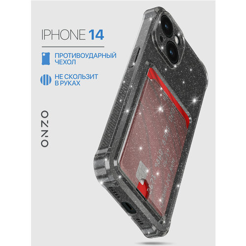 Чехол картхолдер для iPhone 14 с усиленными углами / Накладка на Айфон 14 темно-прозрачный с блестками