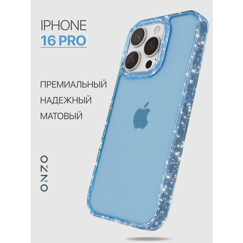 Защитный чехол для iPhone 16 Pro матовый прозрачный голубой / Бампер на Айфон 16 Про с блестками серебристыми