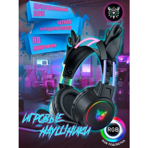 Игровые наушники ONIKUMA X15 pro Pink Star черные с оленьими ушками и подсветкой