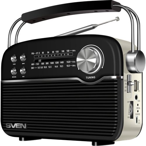черныйУстройство имеет встроенное FM/AM/SW радио, поворотную телескопическую антенну, возможность воспроизведения музыки с USB flash и microSD карт памяти и встроенную батарею; удобный ремешок для переноски. Модель имеет «теплый ламповый» дизайн. Помимо перечисленных достоинств, может заряжать мобильные устройства– это очень актуально в долгих путешествиях. Этот радиоприемник можно слушать даже ночью и не бояться при этом разбудить окружающих, ведь у устройства есть выход для наушников. SVEN SRP-555 – отличный попутчик для поездок, путешествий и прогулок. Он легкий, удобный, компактный и многофункциональный, не займет много места и не оставит вас без любимой музыки.