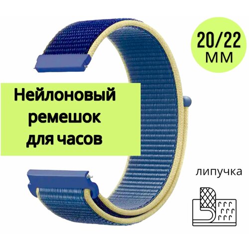 Универсальный нейлоновый Nylon ремешок 22 мм липучка для часов. Цвет синий/желтый.