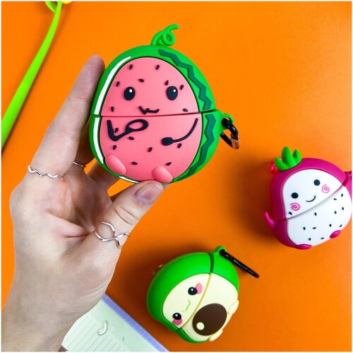 Силиконовый чехол для Apple AirPods 1 и AirPods 2 Trendy с карабином / Кейс для Эпл Аирподс 1 и Аирподс 2 с держателем (Арбуз)