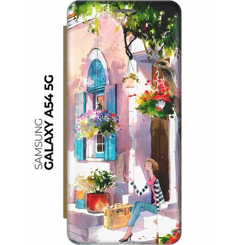Чехол-книжка Девочка на цветущей улочке на Samsung Galaxy A54 5G / Самсунг А54 золотой