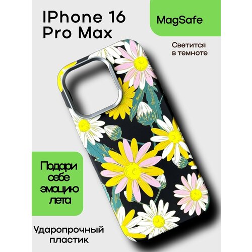 Чехол на IPhone 16 Pro Max с MAGSAFE женский из ударопрочного пластика с цветами и защитой камеры зеленый