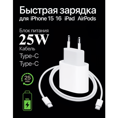Быстрая зарядка 25W для iPhone 16, 16 Plus, 16 Pro, 16 Pro Max, 15, 15 Plus, 15 Pro, 15 Pro Max, iPad, AirPods