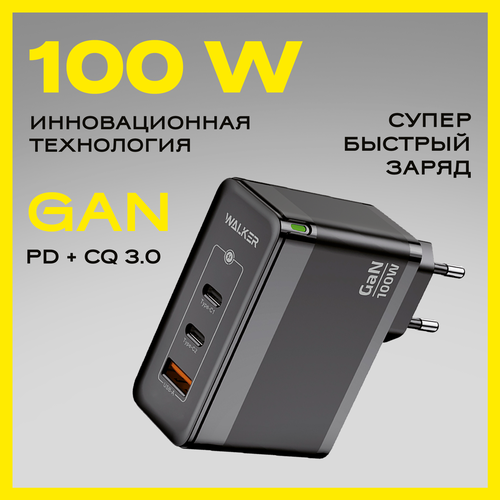 Зарядное устройство для телефона, WALKER, WH-47 GaN, черное, 100Вт, USBx1/Type-Cx2, QC 3.0+PD // зарядка для айфона, блок питания type c, зарядка type c