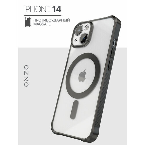 Чехол мэгсэйф для iPhone 14 с усиленными углами / Бампер на Айфон 14 с магнитом, прозрачный с черными гранями