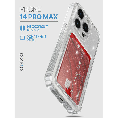 Противоударный чехол на iPhone 14 Pro Max с картхолдером / Бампер на Айфон 14 Про Макс прозрачный с серебристыми блестками