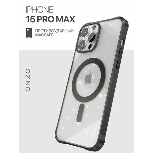 Противоударный чехол мэгсэйф для iPhone 15 Pro Max / Бампер на Айфон 15 Про Макс с рельефными черными гранями, прозрачный с блестками