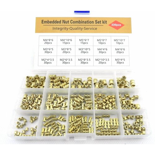 Набор Круглые резьбовые втулки (вставки) с прямой накаткой со сквозным отверстием из латуни 15 видов/ 330 шт.