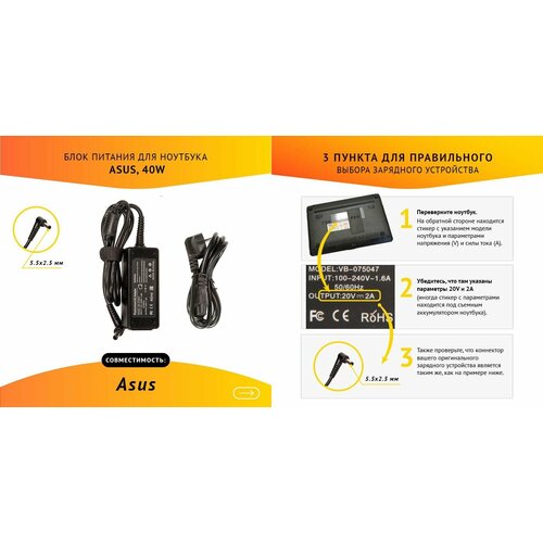 Power unit / Блок питания для ноутбука Asus 20V, 2A, 40W 5.5х2.5мм