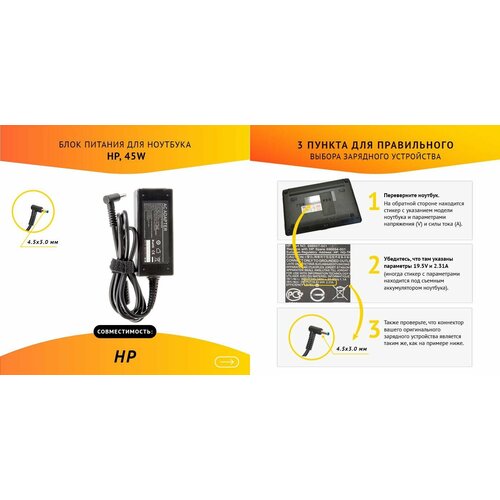Power unit / Блок питания для ноутбука HP 19.5V, 2.31A, 45W, 4.5x3.0 без кабеля