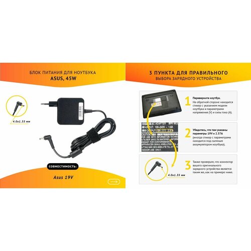 Power unit / Блок питания для ноутбука Asus 19V, 2.37A, 45W, 4.0x1.35 с кабелем, OEM