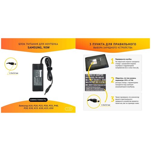 Power supply / Блок питания (зарядка) для ноутбука Samsung A10, P20, P25, P30, P35, P40, P50, V20, V25. X20, X25, X50, 19V, 4.74A, 5.5х3.0 без кабеля
