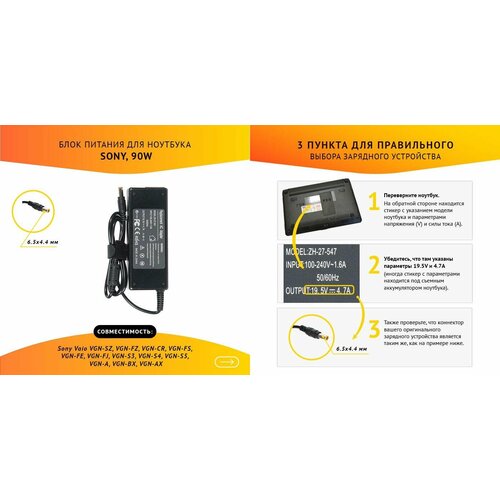 Блок питания (зарядка) для ноутбука Sony Vaio VGN-SZ, VGN-FZ, VGN-CR, VGN-FS, VGN-FE, 19.5V, 4.7A, 90W, 6.5х4.4 без сетевого кабеля
