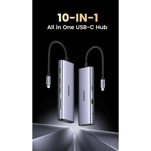 Конвертер UGREEN CM498 (15601) USB-C To 3*USB 3.0 A+HDMI+VGA+RJ45 Gigabit+SD/TF+AUX3.5mm+PD Converter - Gray