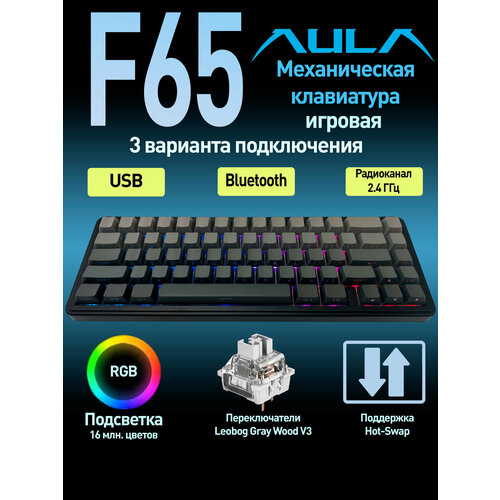 Клавиатура AULA F65 Grey Leobog GreyWoodV3 Switch (3263) черный/серый Английская раскладка USB, Радиоканал, Bluetooth