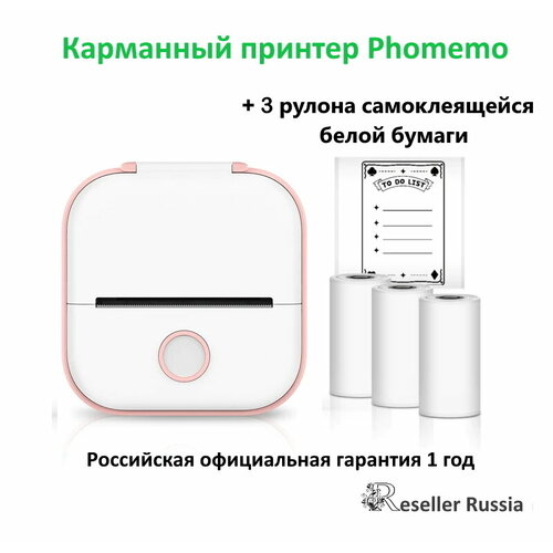Мини принтер Phomemo + 3 рулона белой самоклеящейся бумаги / Карманный принтер для смартфона / Блютуз принтер для телефона / Мини-принтер