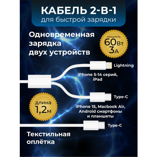 Кабель 2 в 1 USB-C - Lightning + USB-С 3А 60 Вт текстиль