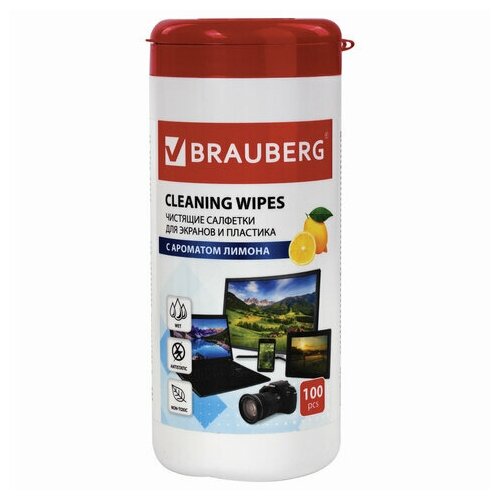 Салфетки для экранов всех типов и пластика BRAUBERG с ароматом "лимон", комплект 5 шт, туба 100 шт, влажные, 511688