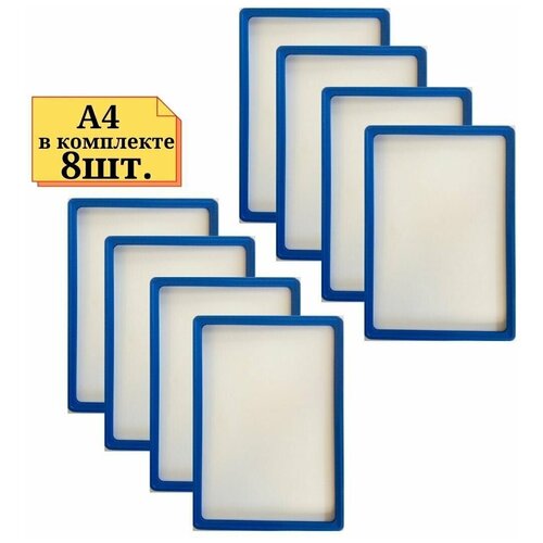 8шт Рамка А4 синяя с антибликовым протектором, Пластиковая рамка, Рамка для ценника, Ножки и крепление не идет в комплекте. PF-A4-С