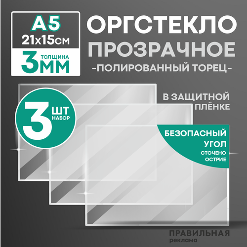 Оргстекло прозрачное А5, 5 мм. - 3 шт. (прозрачный край, защитная пленка с двух сторон) Правильная реклама