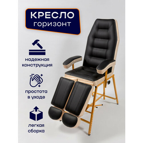Педикюрное кресло Горизонт, кушетка косметологическая для салона красоты с регулировкой высоты, 180*56, Уютный мастер, золотистый металл, черный/золото