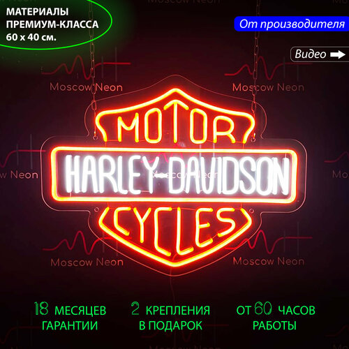 Неоновый светильник / Неоновая светодиодная вывеска на стену / Настенная неоновая лампа, надпись "Motor Harley-Davidson cycles", 60 х 40 см.