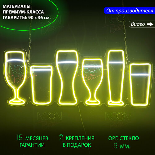 Неоновый светильник / Неоновая светодиодная вывеска на стену / Настенная неоновая лампа "Бокалы пива", для паба и бара, 90 х 36 см.