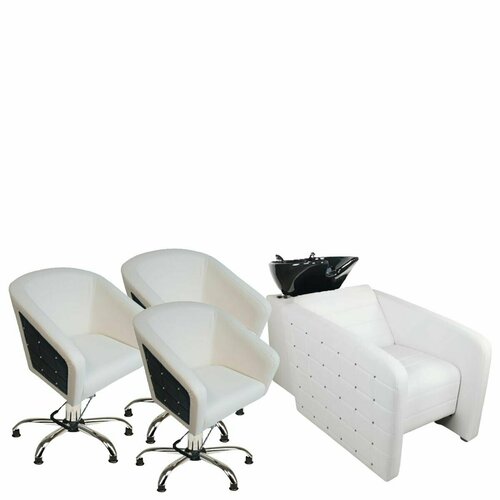 Парикмахерский комплект "Гламрок", Белый, 3 кресла, Черная вставка, Гидравлика пятилучье, 1 мойка глубокая черная раковина