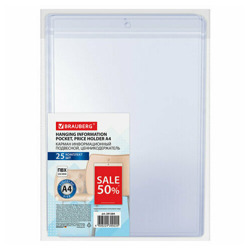 Карман информационный подвесной, ценникодержатель А4, комплект 25 шт, ПВХ, BRAUBERG, 291284 (арт. 291284)