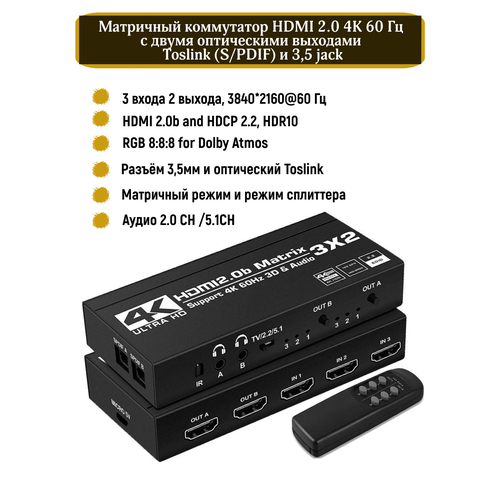Матричный коммутатор (сплиттер свитчер) HDMI 2.0 4K 60 Гц с двумя оптическими выходами Toslink (S/PDIF) и 3,5 jack