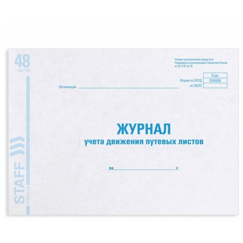 Журнал учета путевых листов форма №8, 48 л, картон, офсет, А4 (203х285 мм), STAFF, 130082