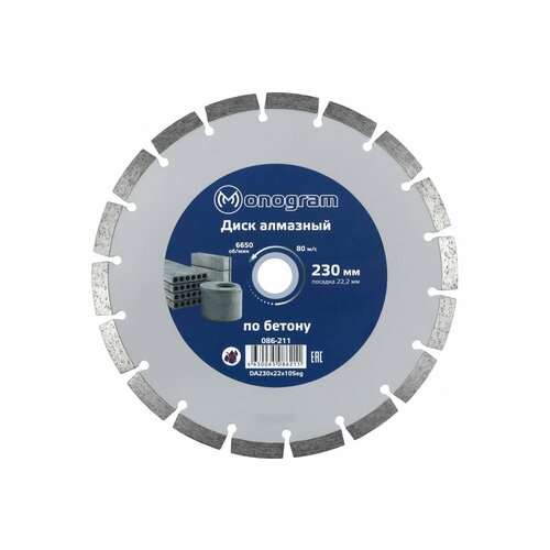 Диск алмазный сегментный по бетону Basis (230х22x10 мм) MONOGRAM 086-211